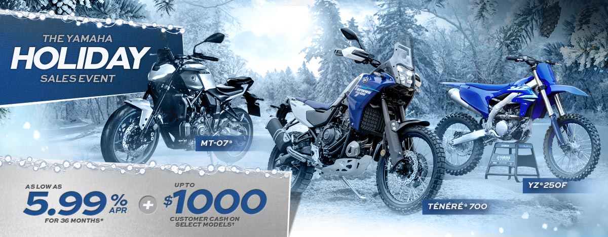 *Offer available on approved purchases of new 2023 – 2026 Yamaha Motorcycles made on the Yamaha Credit Card issued by WebBank. Offer valid 10/1/2025 – 12/31/2025. Account must be open and current to be eligible for this offer. Promotional 5.99%, 7.99%, 14.49%, 21.99% APR financing with minimum payments of 3.05%, 3.14%, 3.45%, or 3.82% are effective until the purchase is paid in full. Minimum interest charge $2 per month. Promotional rates are based on creditworthiness. Not all applicants will qualify.